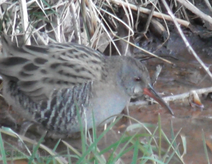 Einen Tag später, wieder kurz vor Einbruch der Dämmerung, begann die Wasserralle wieder ihre Aktivität. Ich hatte diesmal eine bessere Position gewählt, von der ich aus etwas größerer Distanz die gestrige Stelle einsehen konnte. Und diesmal hatte ich Glück!